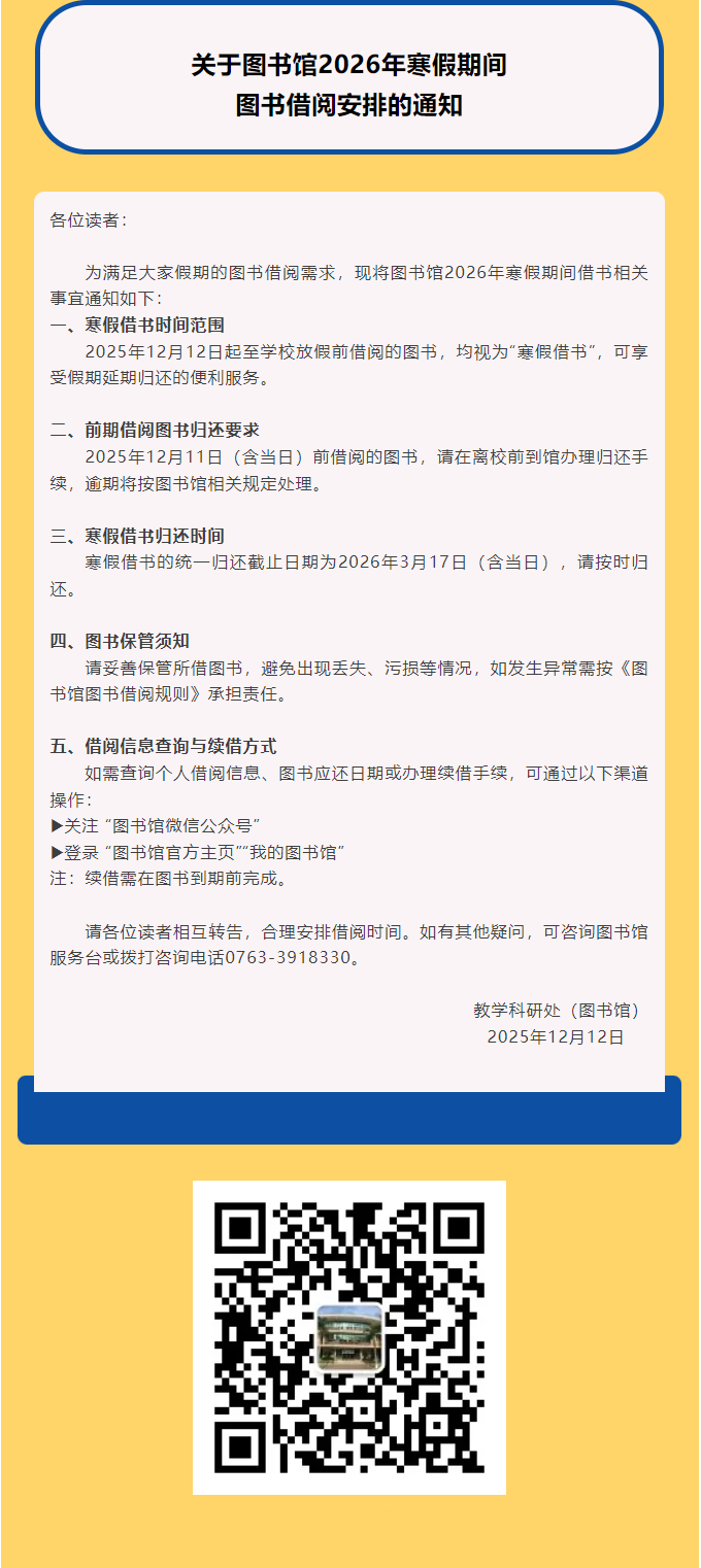关于图书馆 2026年寒假期间图书借阅安排的通知