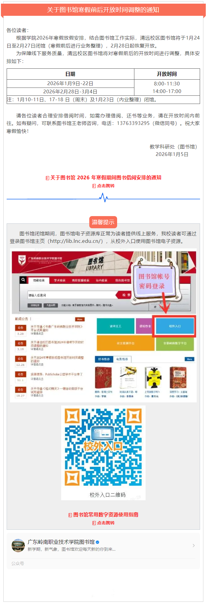 清远校区图书馆2026年寒假前后开放时间调整通知